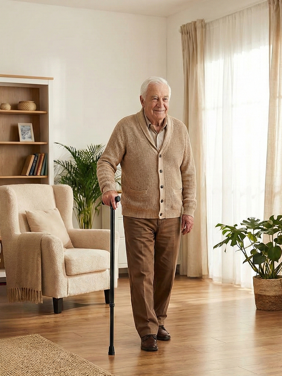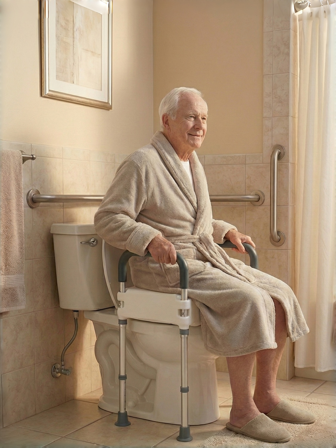 Anti-slip seat and adjustable height for easier standing and stable seated support.